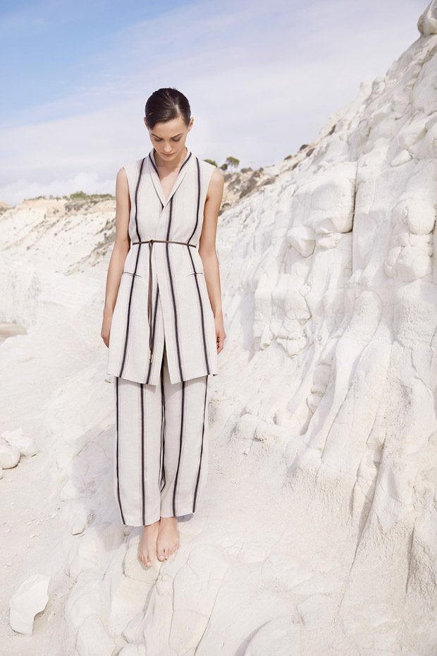 Giocano su un effetto ottico la linea di abiti in cotone seersucker dai colori estivi naturali; le proposte in lino dall’aspetto denim, arricchite da impunture a contrasto colore cognac; e i preziosi inserti in trama di organza o lurex nei cotoni e nei lini. Si arricchisce di volants e di colli bicolori la linea di camicie in tessuti estivi.