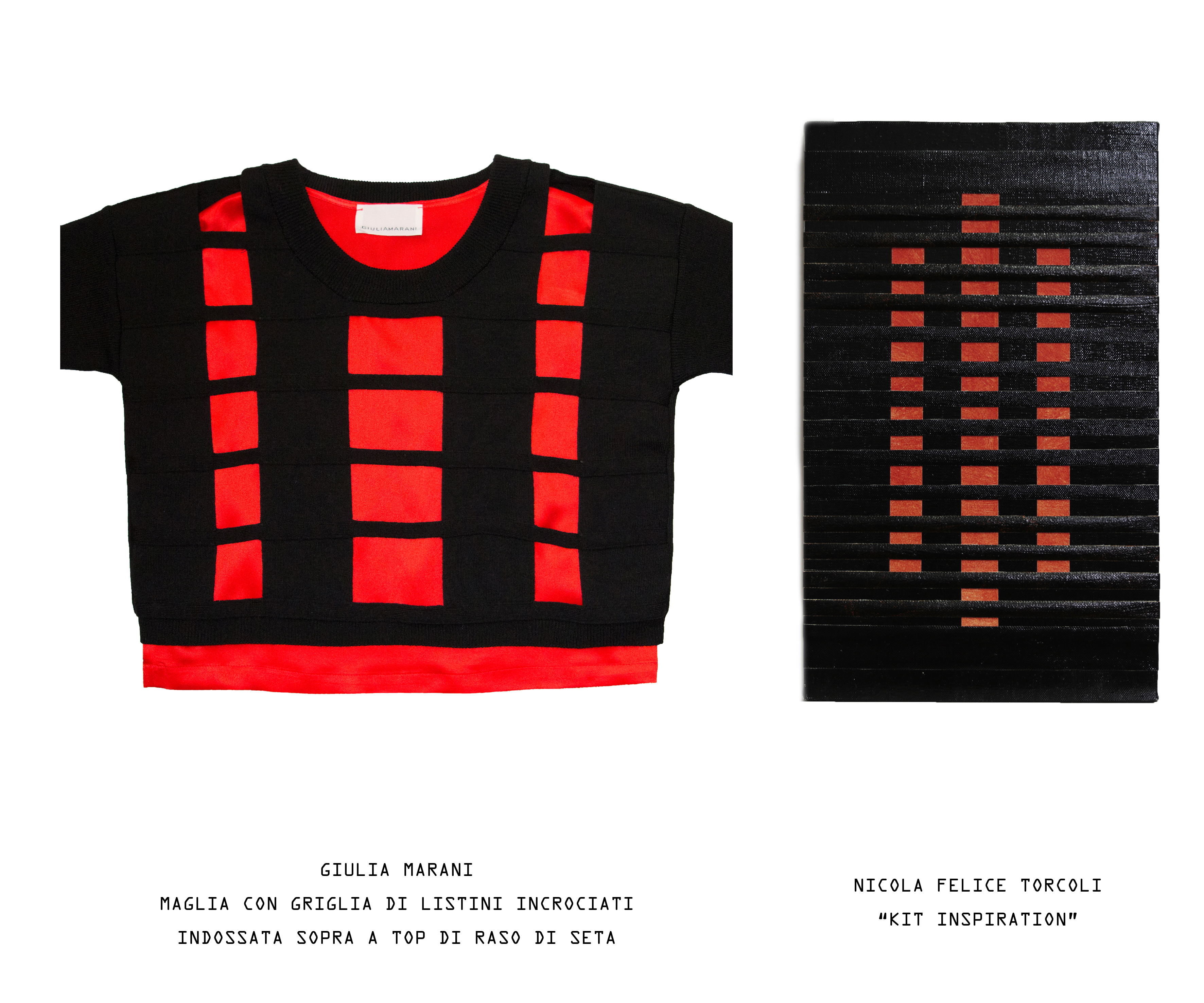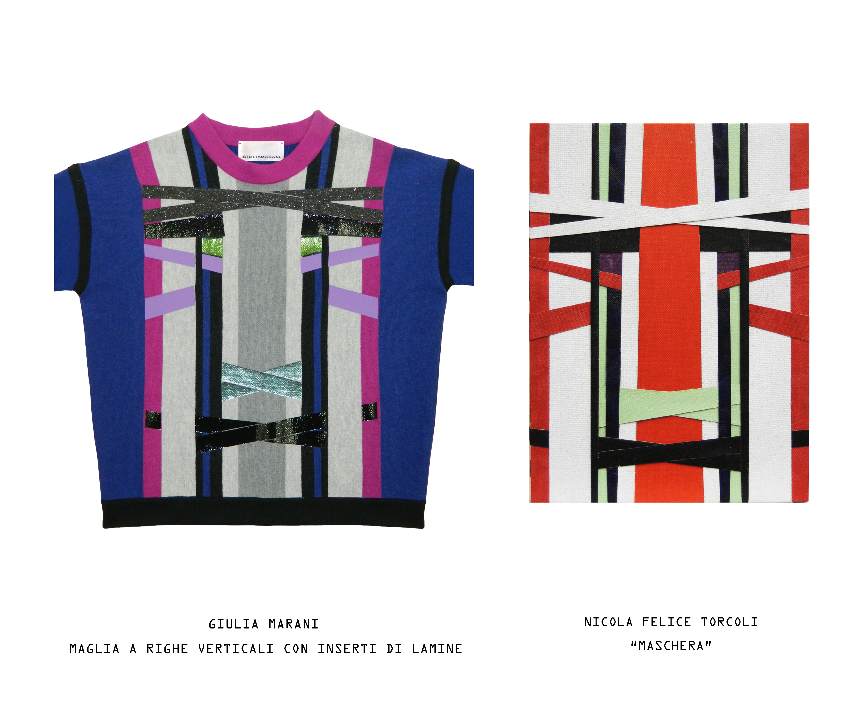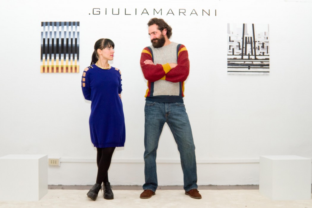 Giulia Marani e Nicola Felice Torcoli nella loro ricerca artistica giocano costantemente a Tetris, ovvero incastrano tetramini e compongono. L’artista compone le opere intrecciando delle strisce di tela, ottenute tagliando a liste una tela precedentemente dipinta ad olio. La stilista, attraverso un’accurata ricerca, crea i capi tessendo il filato e assemblando il tessuto. Perchè è tutta una questione di mixare insieme tecniche diverse, stratificando un processo sull’altro con un approccio sperimentale che lascia libera la creatività.