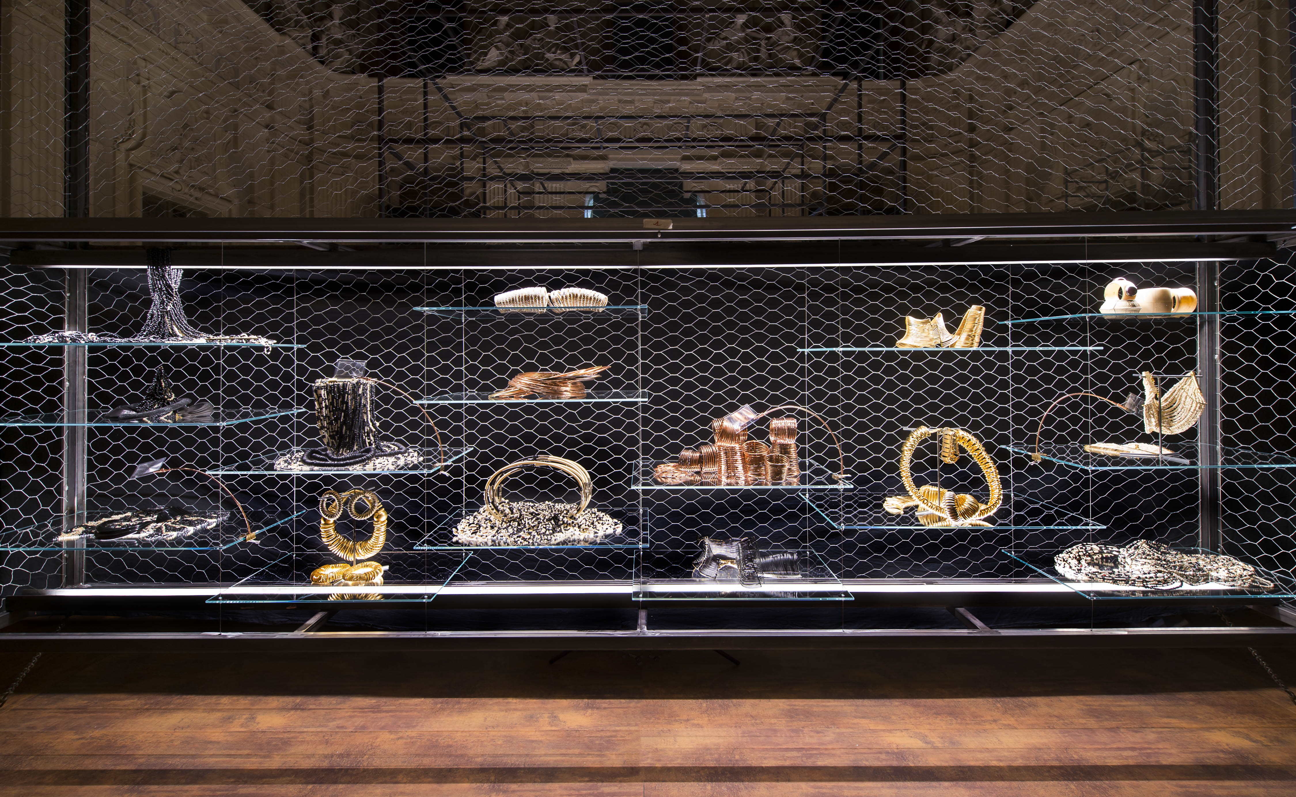 L’allestimento media tra questi due eccessi risolvendosi in una serie ordinata di 6 contenitori in struttura di ferro, come gabbie nelle quali imprigionare e difendere queste creature fragili e strane, questi ornamenti corporali pensati per membra e per gesti e per curve sinuose femminili.