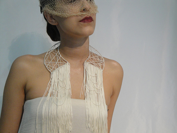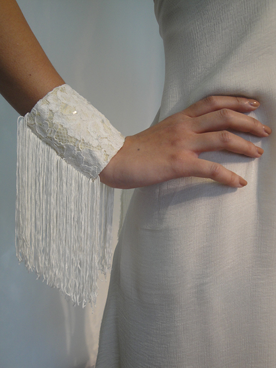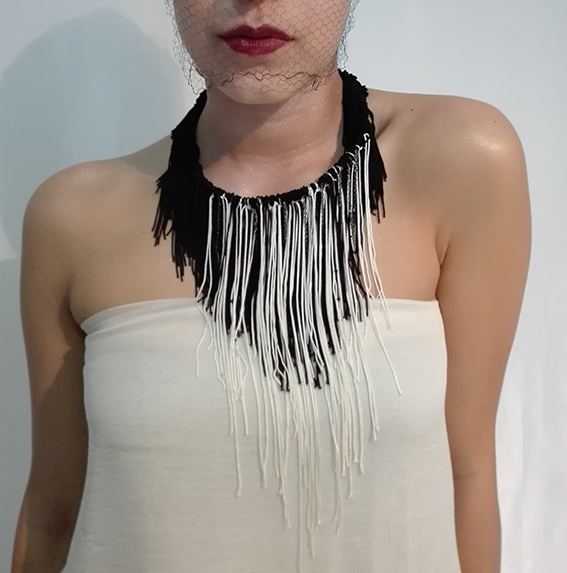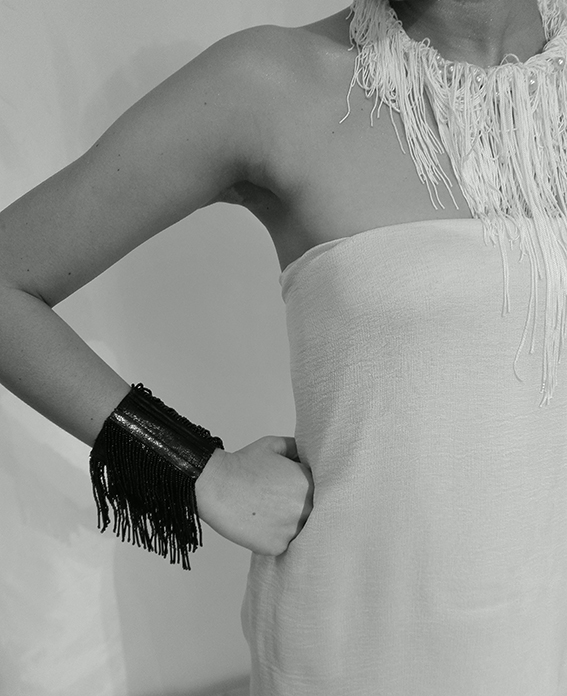 Il leitmotiv quindi sono le  frange che, leggerissime, assecondano ed enfatizzano ogni singolo gesto; due soli colori, bianco e nero, assoluti e sintetici, perché l’euforia non ha incertezze. Forme sinuose, avvolgenti, oggetti che decorano il corpo nei due punti che rimandano a una sensualità raffinata: il collo e le mani.