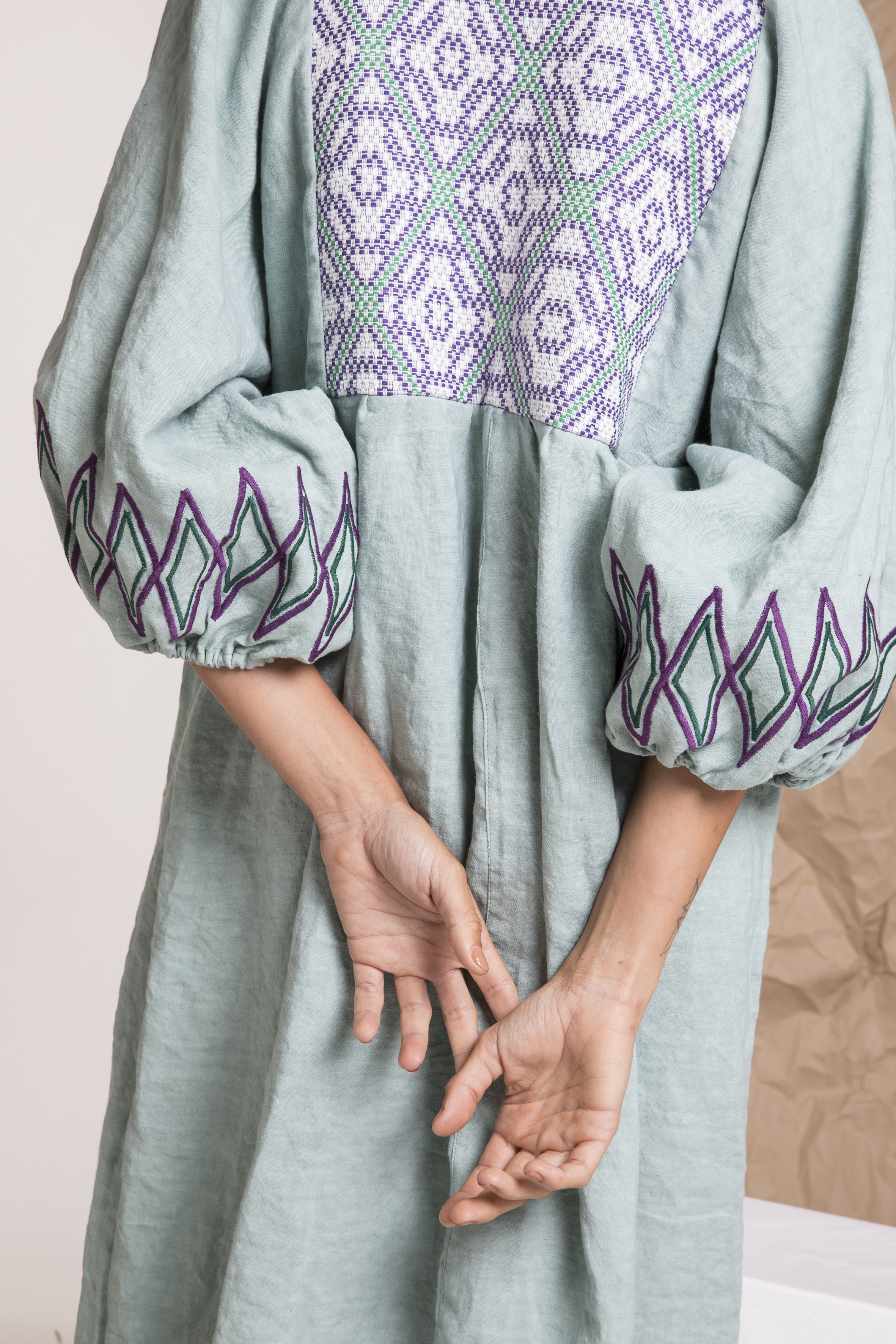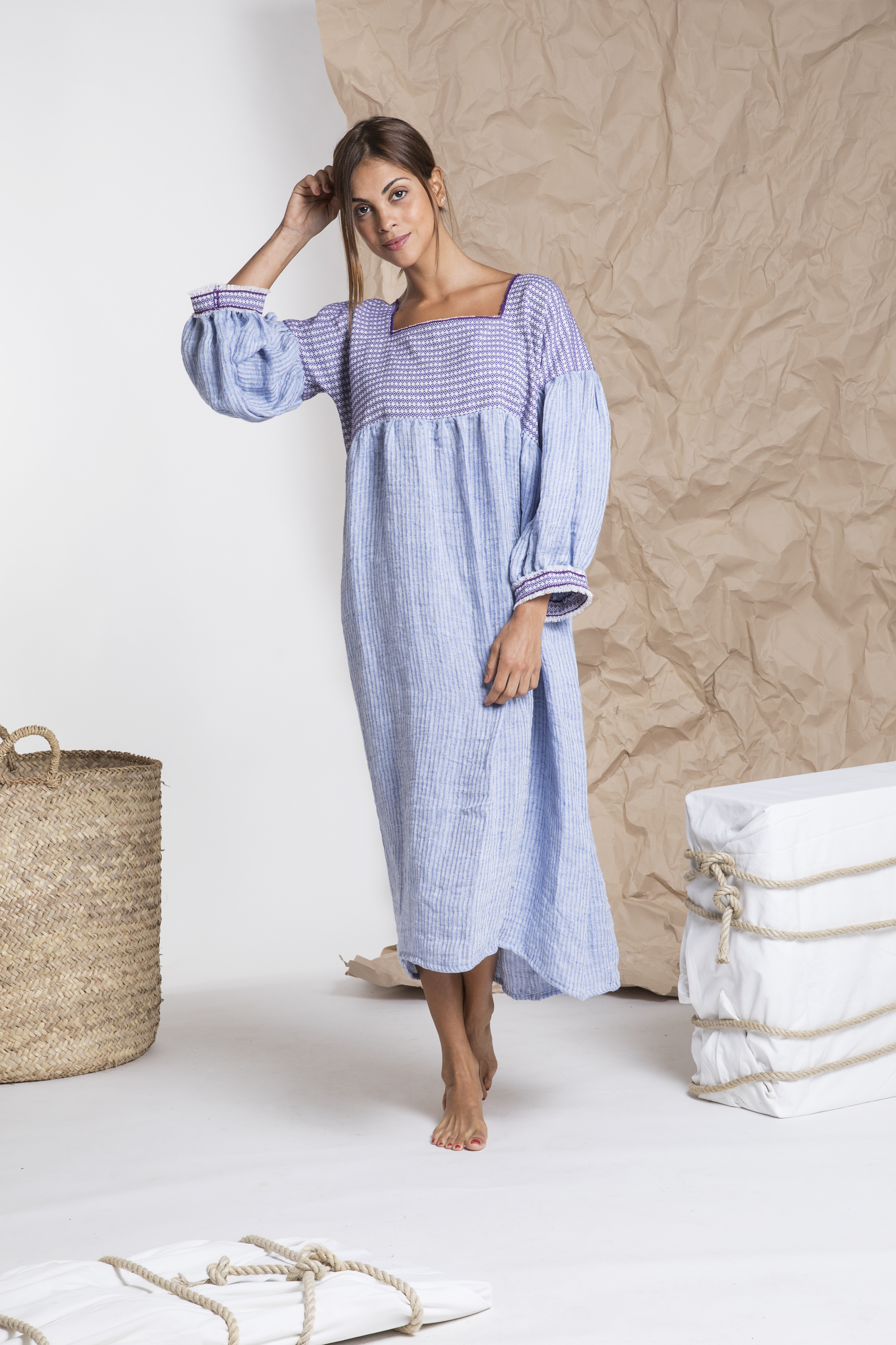 L’amore da sempre per i nostri tessuti tradizionali salentini mi ha portato ad utilizzarli in una nuova forma, diversa da quella del passato, combinandoli a ricami fatti a mano e al lino con trattamento stone washed, tessuto scelto come base dei miei vestiti in quanto fresco, ecosostenibile e versatile. Ho sempre sostenuto che la qualità delle materie tessili venisse prima di tutto, trascurando forse in parte la modellistica, tanto era l’entusiasmo per l’assemblaggio dei colori e dei tessuti. Poi invece è venuto fuori un “camicione” one size dalle linee semplici ma che si è rivelato vincente. Le nostri clienti di tutte le età lo adorano perché lo infilano dalla testa senza bottoni e senza cerniere. Et voilà in pochi secondi sei vestita e sei super Chic.
