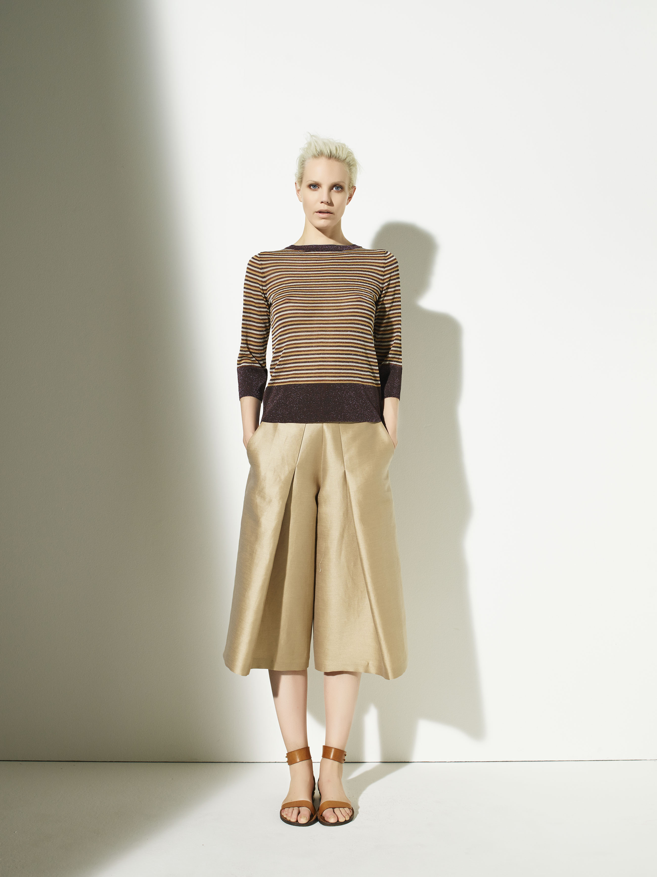 Echi da “Mille e una notte” nei molti tocchi di luce che si ritrovano nei filati sottili, nella seta cotone con stampa “glow”, nelle maglie che evocano il metallo liquido.
