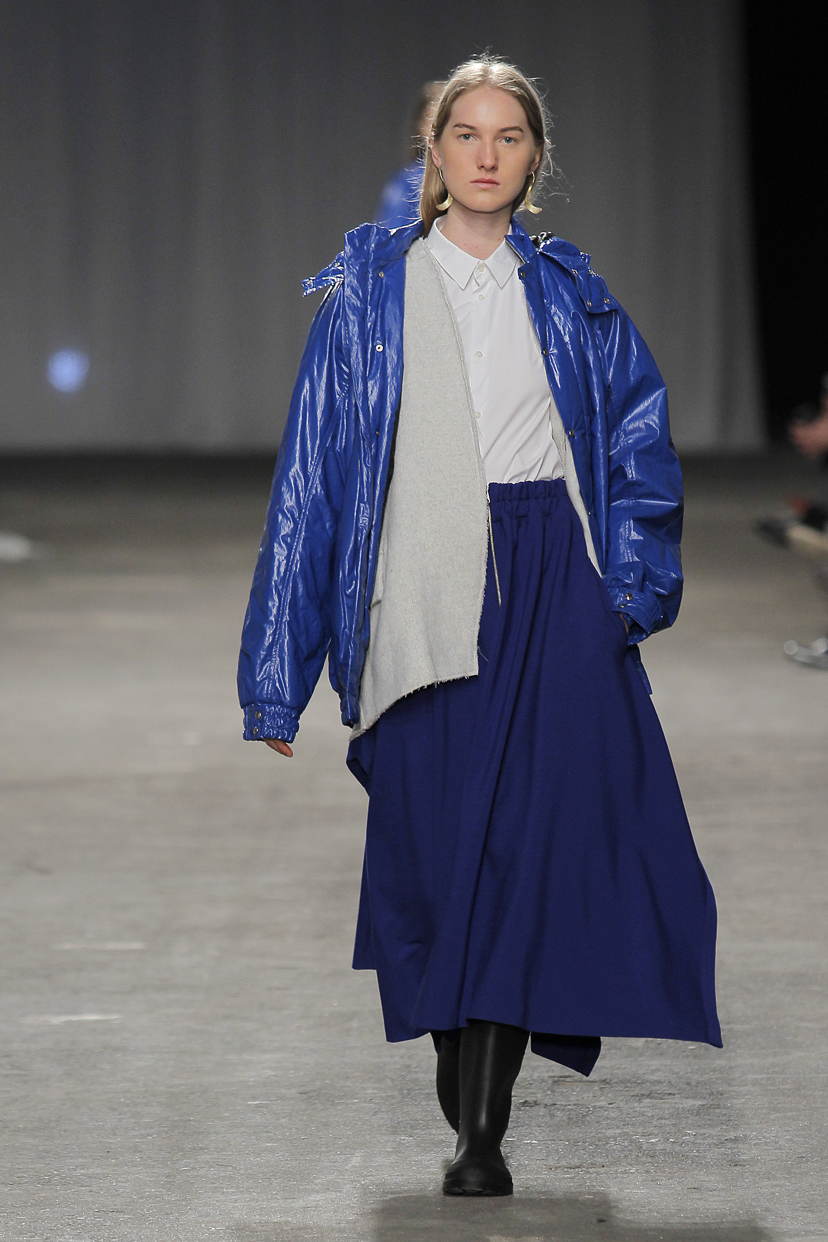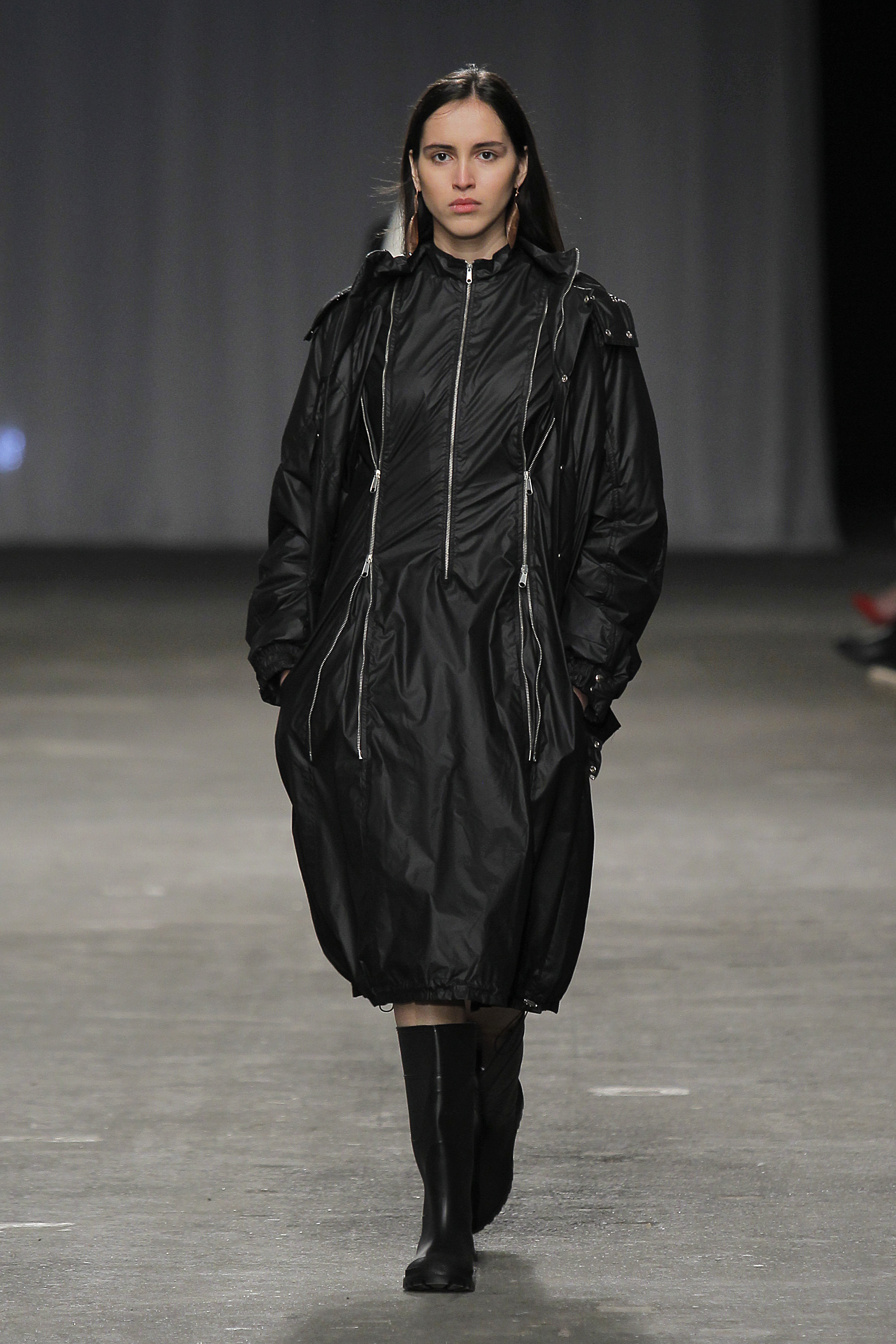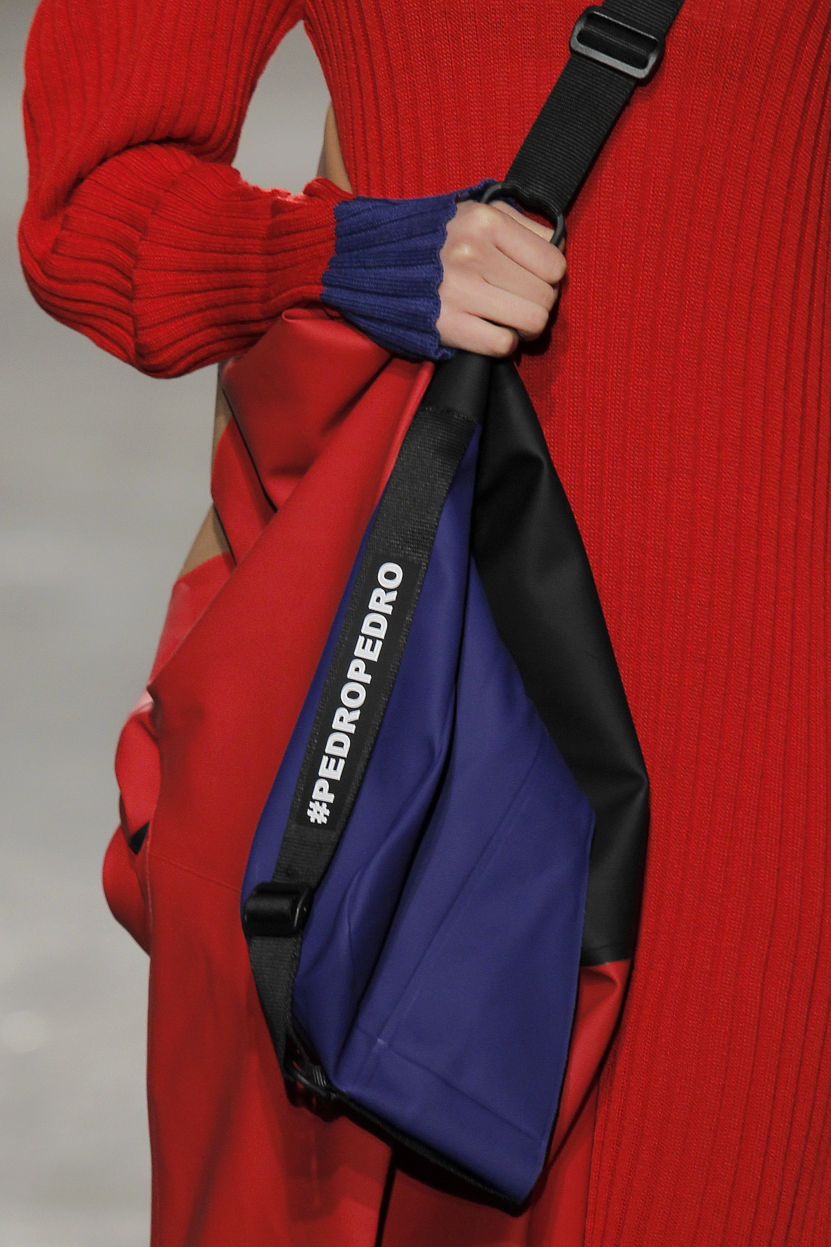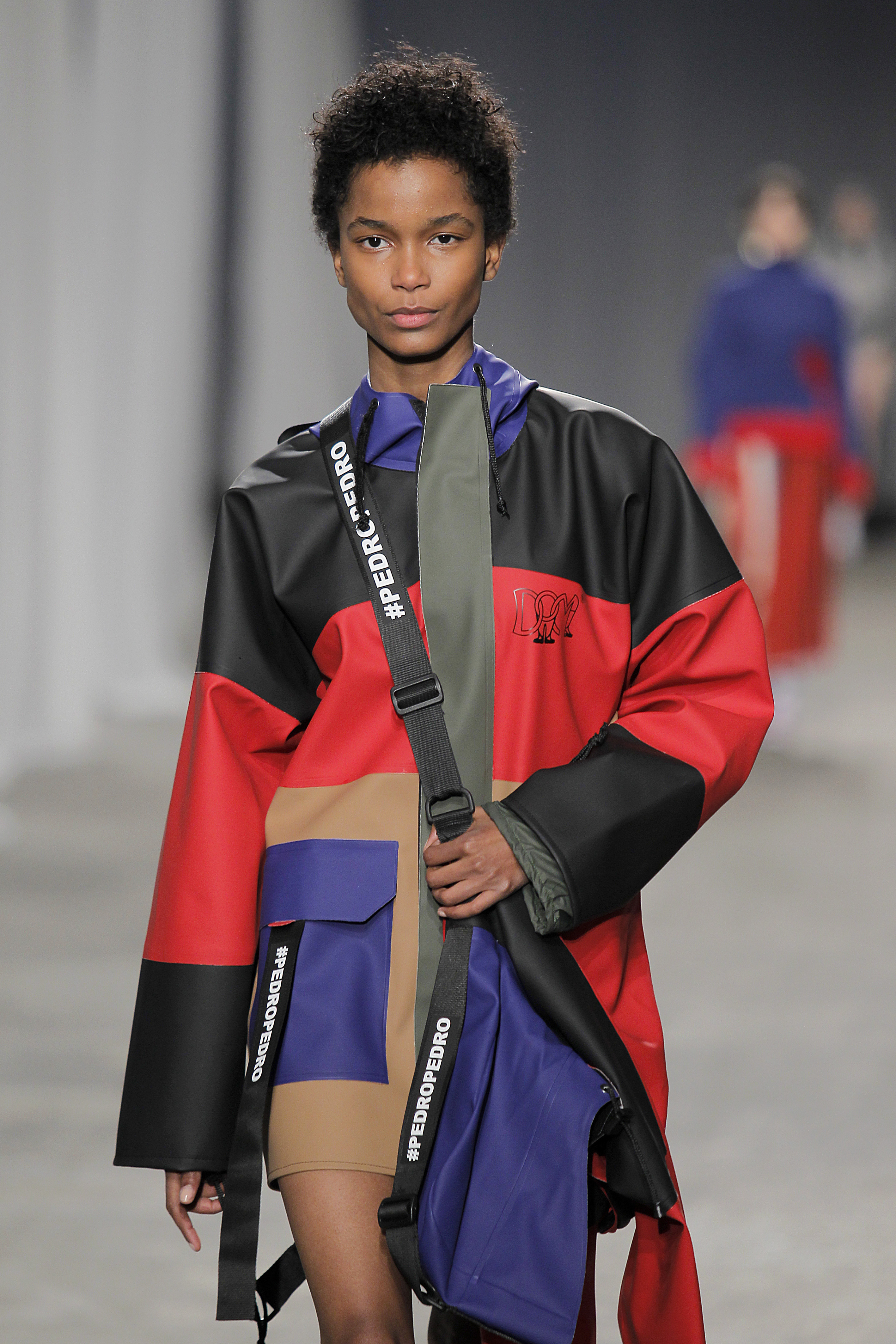Pedro Pedro propone una galleria di abiti dalle tinte decise e nette, prive di sfumature (verde bottiglia, rosso, bianco, blu, nero), su materiali tecnici e plastici (dalla gomma al cotone cerato), combinati in tagli bizzarri, asimmetrici, sfilacciati, a volte composti e montati come patchwork discordanti, quasi sempre dai volumi ambigui.