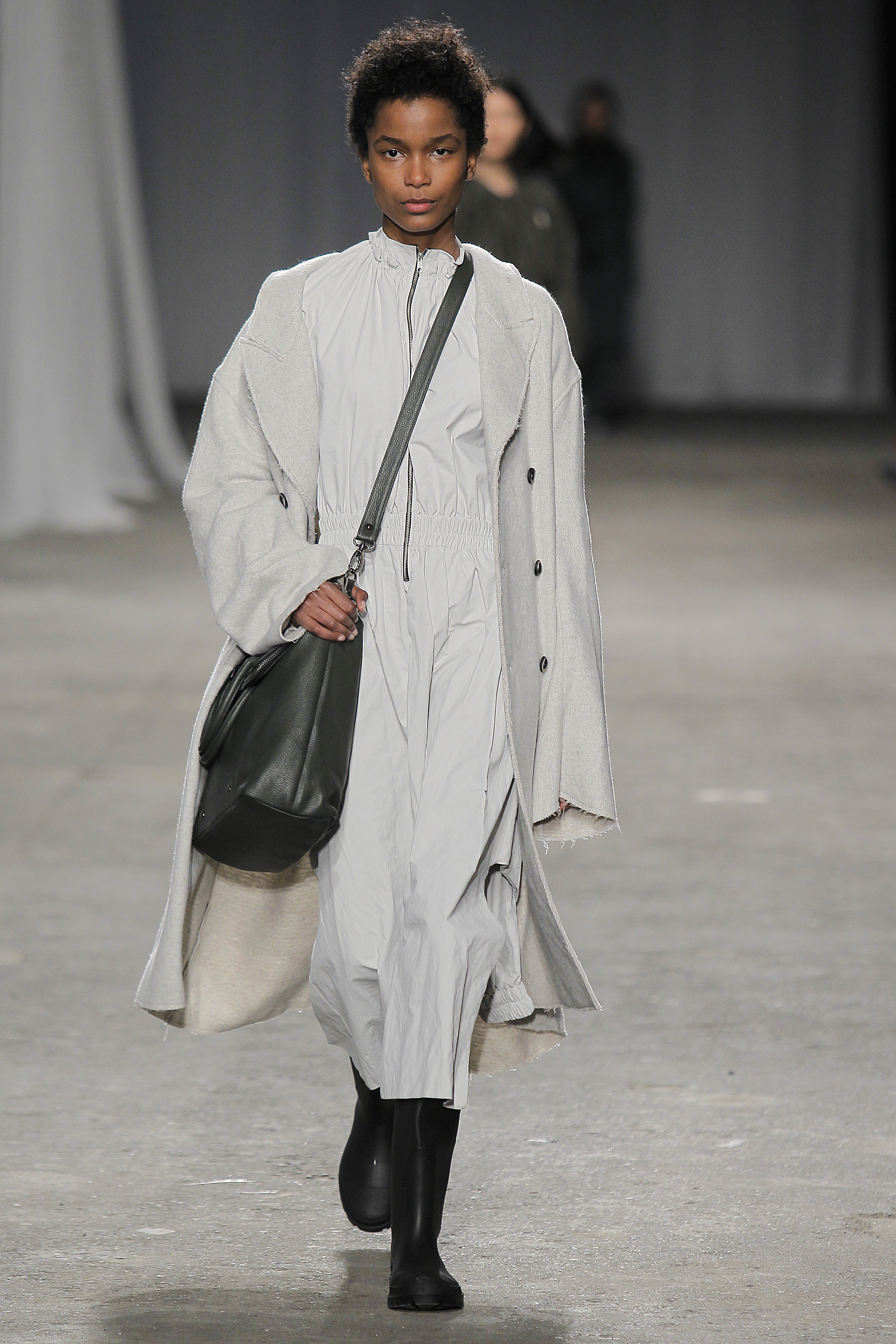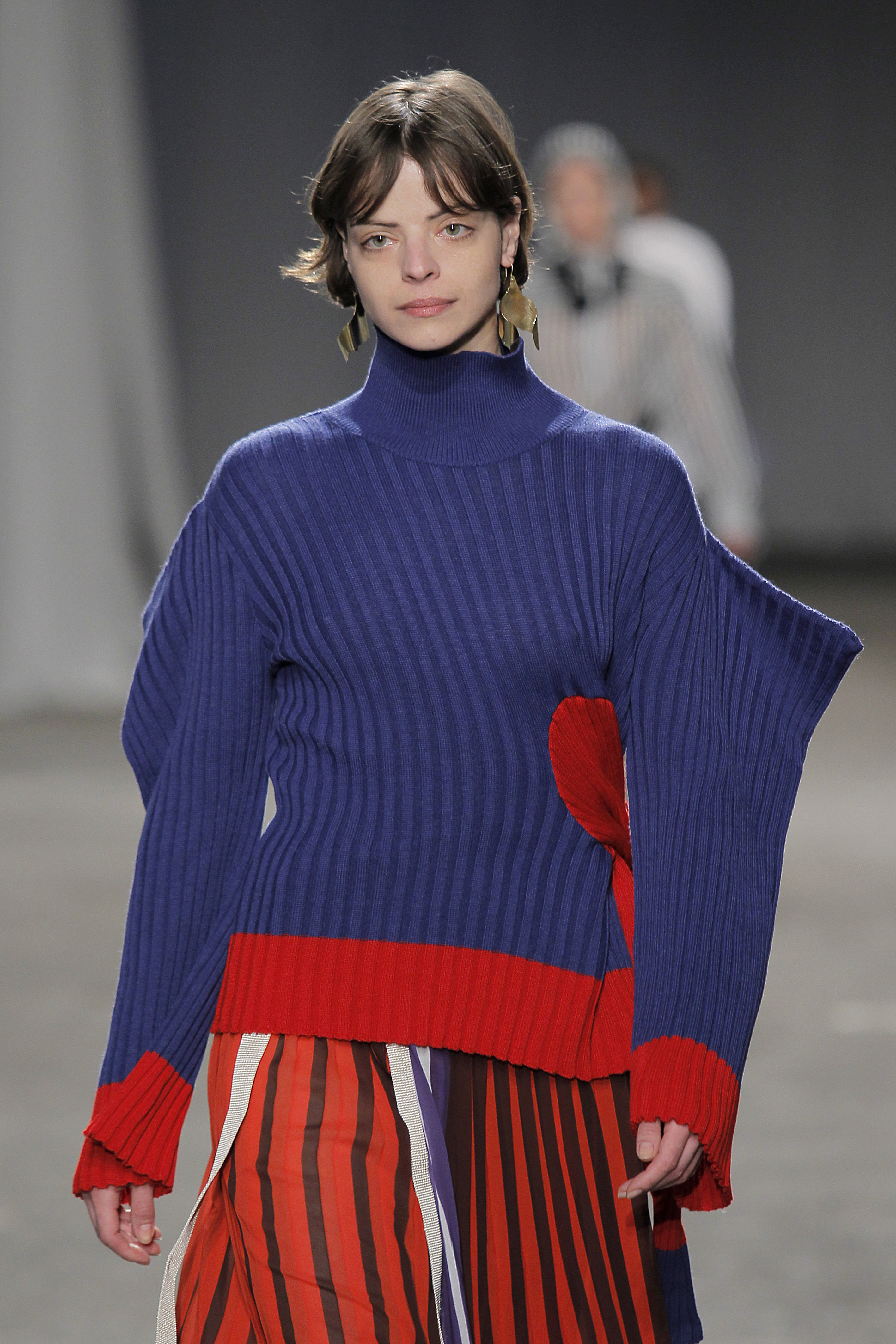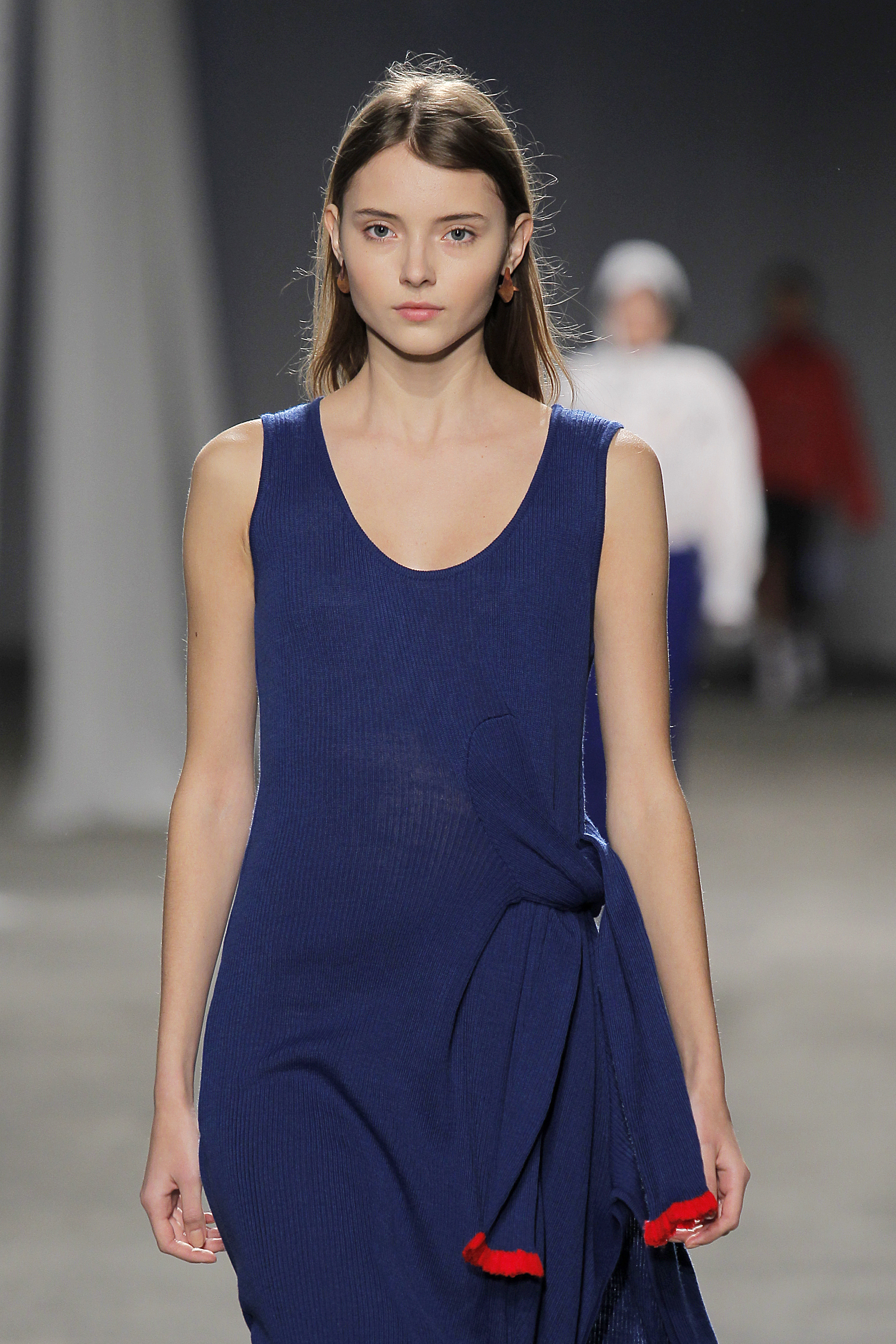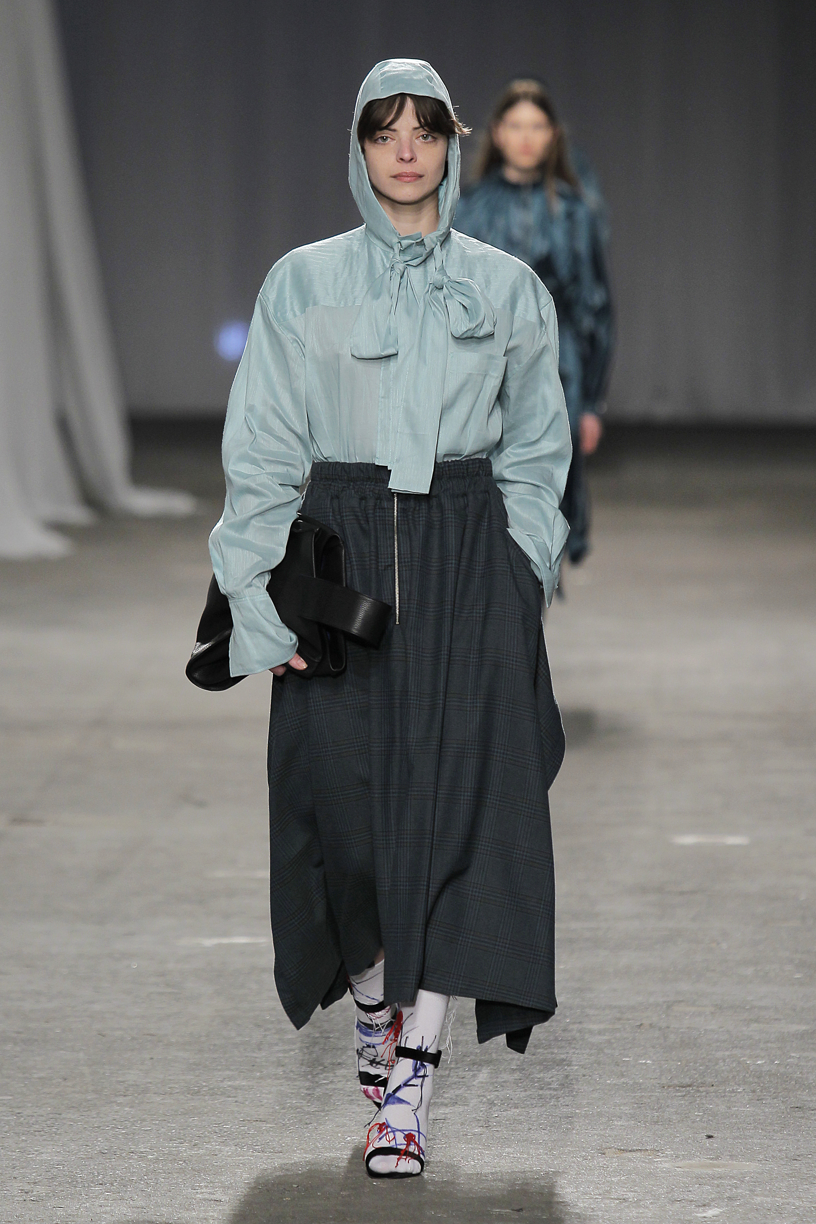 Pedro Pedro propone una galleria di abiti dalle tinte decise e nette, prive di sfumature (verde bottiglia, rosso, bianco, blu, nero), su materiali tecnici e plastici (dalla gomma al cotone cerato), combinati in tagli bizzarri, asimmetrici, sfilacciati, a volte composti e montati come patchwork discordanti, quasi sempre dai volumi ambigui.